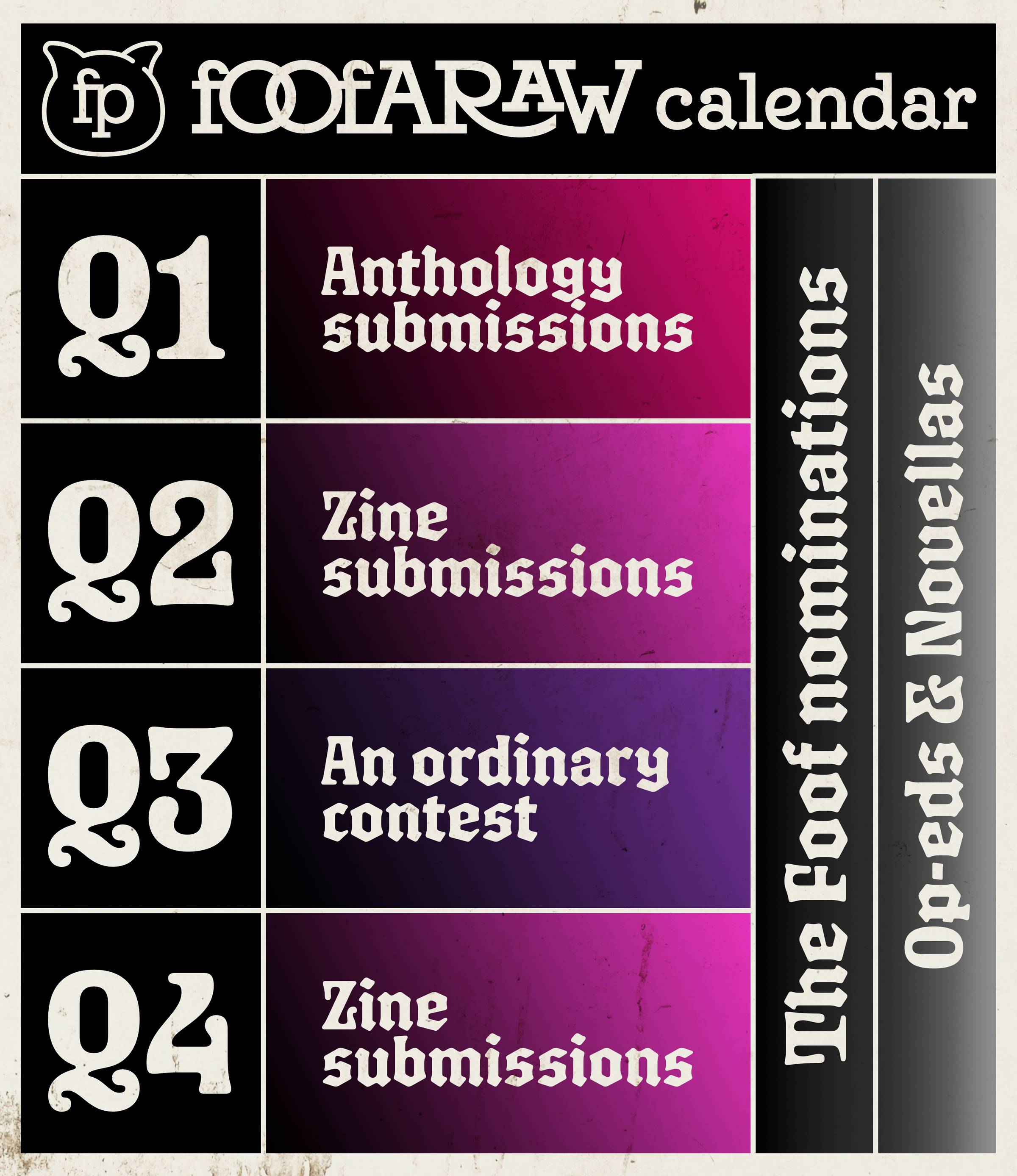 This is the home of information for writers to stay in the know about what's happening on Foofaraw. If you give us your email, we will only use it to let you know about submission, nomination, and contest windows.